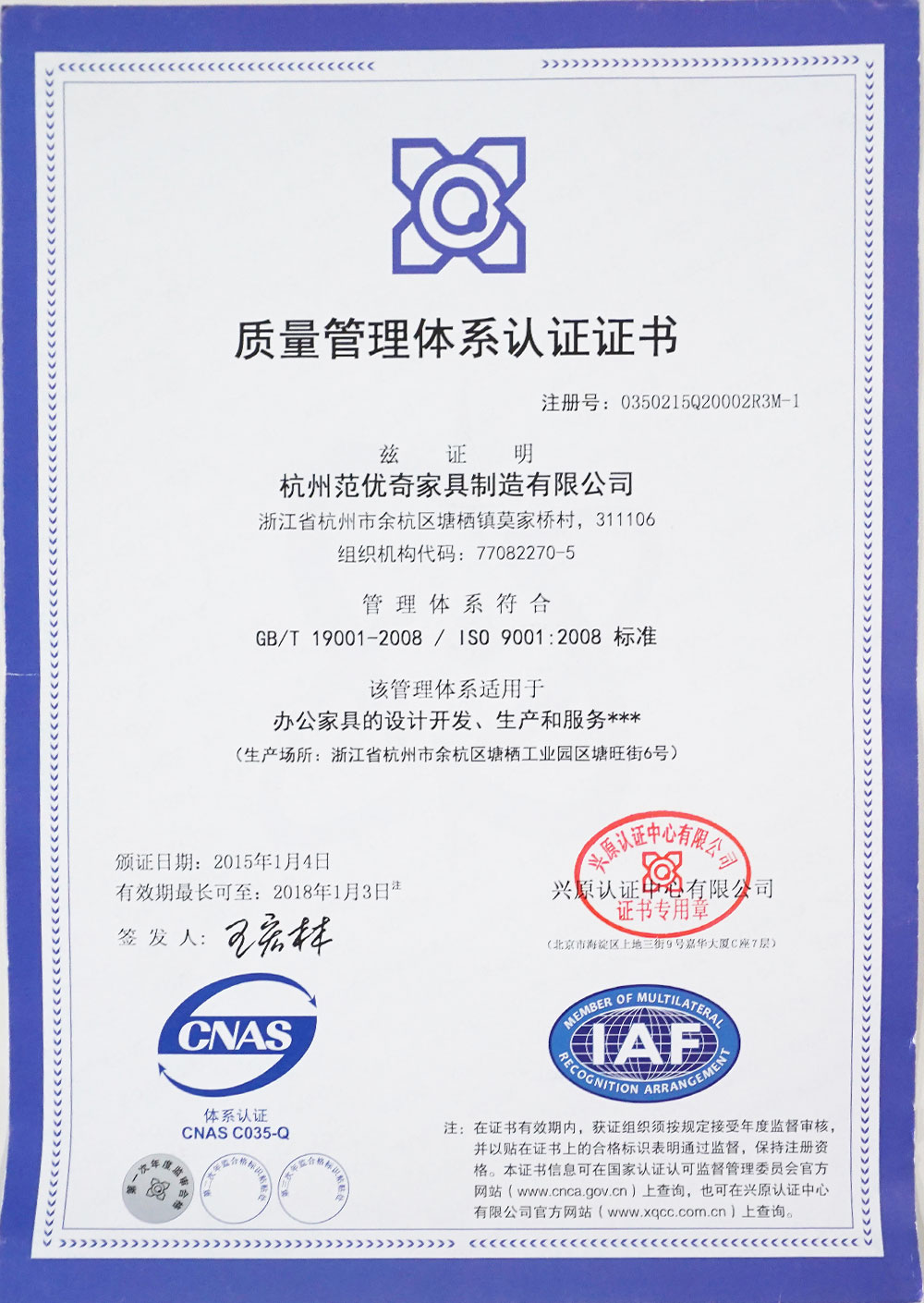 杭州范优奇家具制造有限公司位于中国办公家具产业基地——中国•杭州,是一家专注于现代办公家具的设计、制造、销售、安装和服务的高新技术企业,公司以“创造办公家具行业典范,为客户创造卓越价值”为使命,以卓越品质和真诚服务为客户构建起灵性的商务办公空间,服务客户发展。